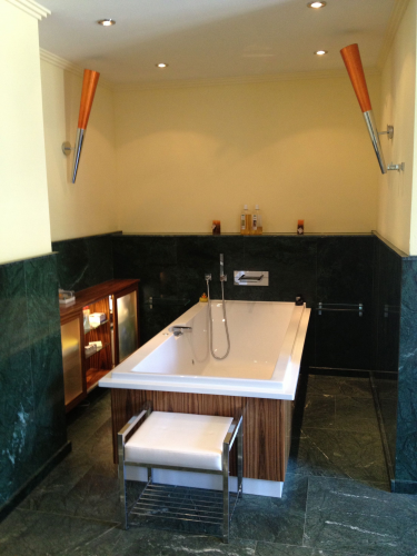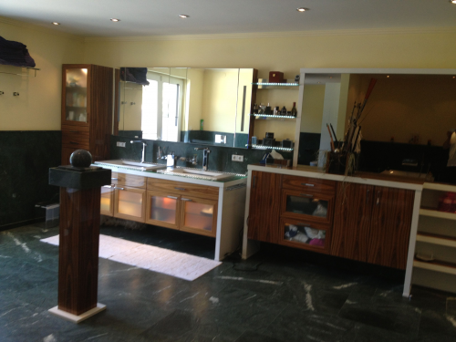Auch hier nur hochwertigste Materialien, Gästezimmer mit Oliospatula Wandspachtelung, sehr großes Schlafzimmer (voll klimatisiert) als Originalnachbau der Hotelzimmer im Burg al Arab mit amerikanischem Kirschholz, exklusives Badezimmer mit 30 qm! Fläche - Bidet, Urinal, 2x WC, Regenschauerdusche mit LED-Technik, 3 Waschtische, LED gesteuerte Badewanne mit elektronisch gesteuerter Canyon-Wassereinlass (Kalt- und Warmwasser farblich abgehoben), TV-Gerät im Wandspiegel!