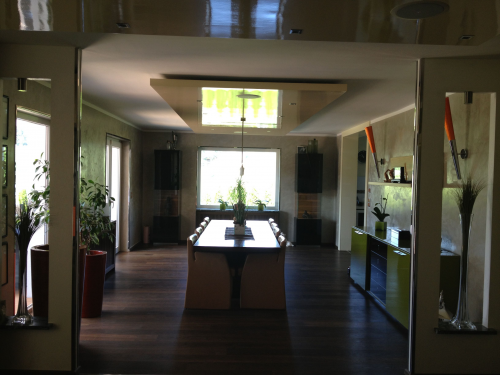 Panorama-Fenster, offener Kamin, Glas-Chrom-Treppe, Dachgeschoss schalldicht durch Klappe verschließbar.